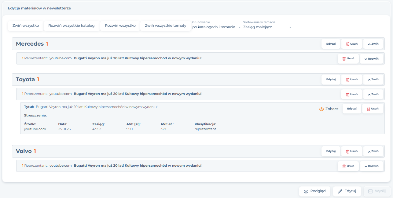 Edycja materiałów w newsletterze