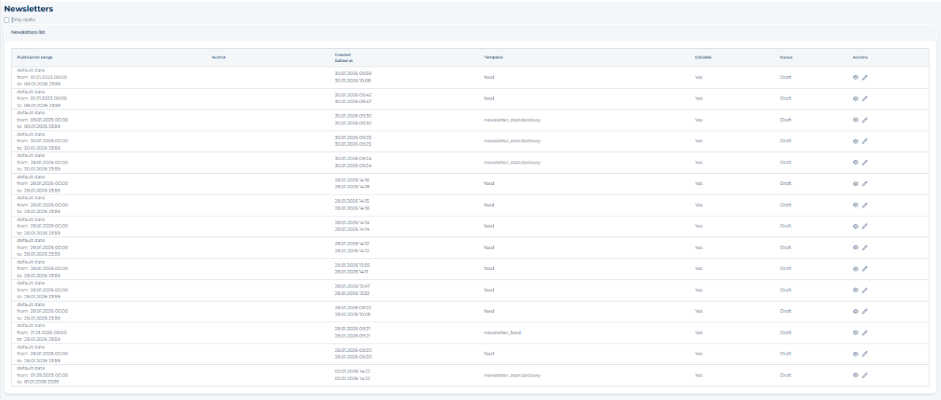 In the menu (top right corner of the dot menu), you will find the Newsletters section, where all drafts and newsletters you have sent are saved.